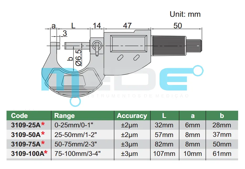 - Faixa de medição : 0-25mm